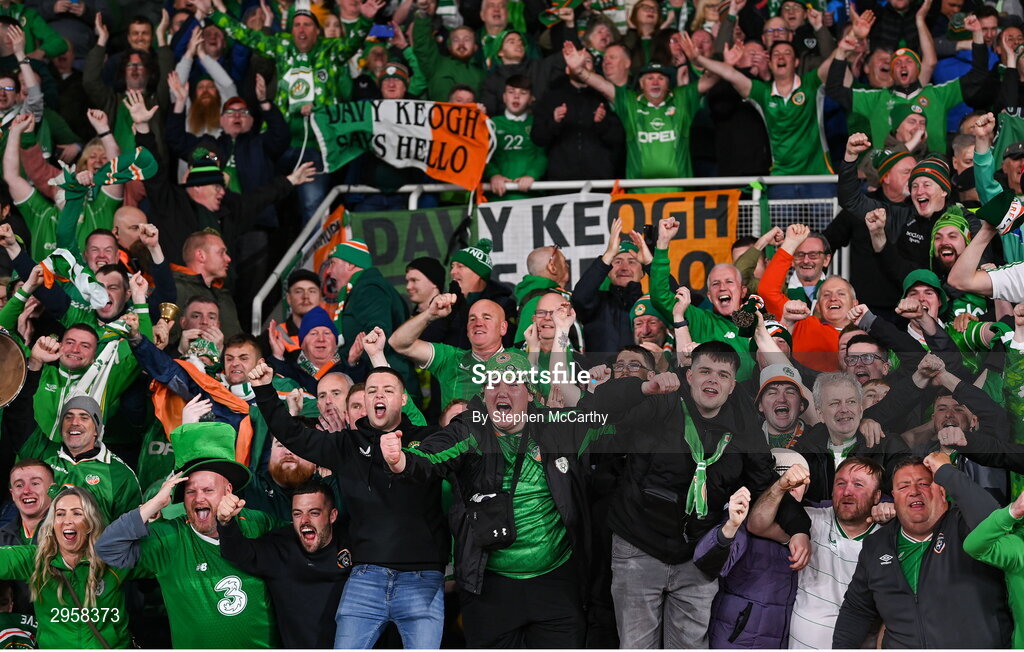 10 October 2024; Republic of Ireland supporters celebrate after Robbie Brady scored their winning goal during the UEFA Nations League B Group 2 match between Finland and Republic of Ireland at the Helsinki Olympic Stadium in Helsinki, Finland. Photo by Stephen McCarthy/Sportsfile