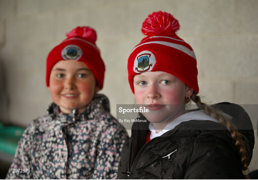 27 October 2024; Ava Horan and Mary Kate English, both 11 years, from Oola, during the Limerick County Senior Club Hurling Championship final match between Na Piarsaigh and Doon at TUS Gaelic Grounds in Limerick. Photo by Ray McManus/Sportsfile