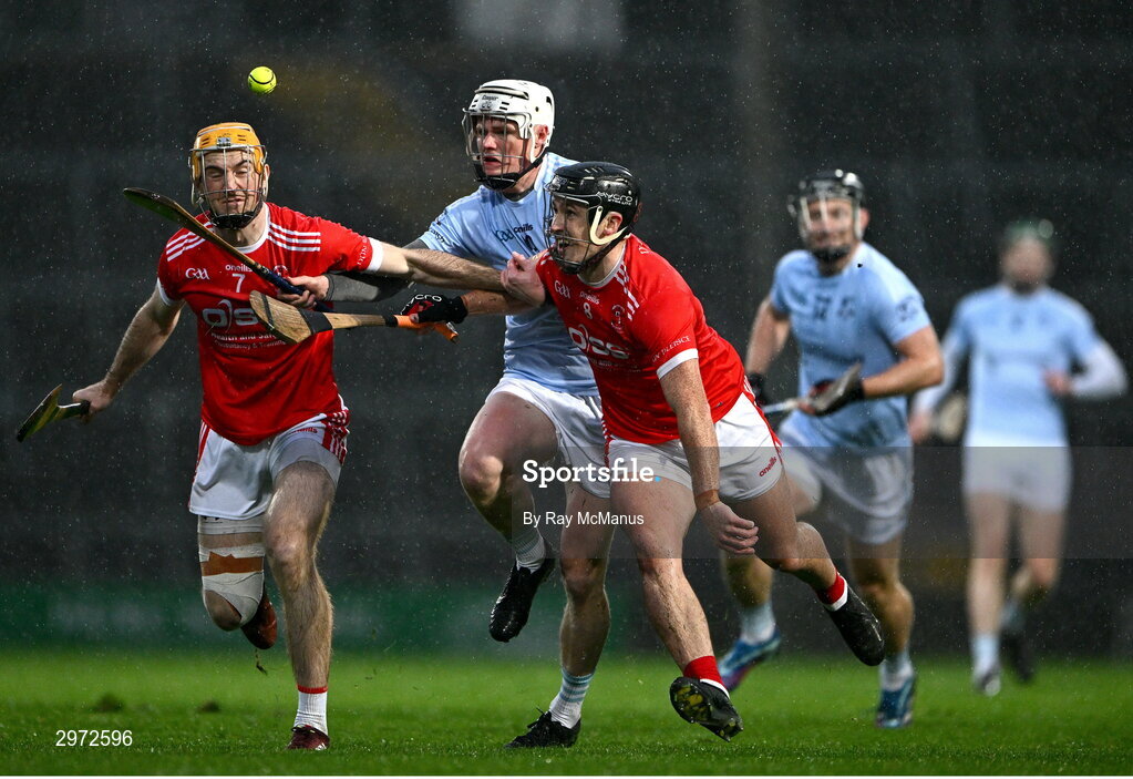 27 October 2024; JJ Carey of Na Piarsaigh is tackled by Richie English and Darragh O'Donovan of Doon during the Limerick County Senior Club Hurling Championship final match between Na Piarsaigh and Doon at TUS Gaelic Grounds in Limerick. Photo by Ray McManus/Sportsfile