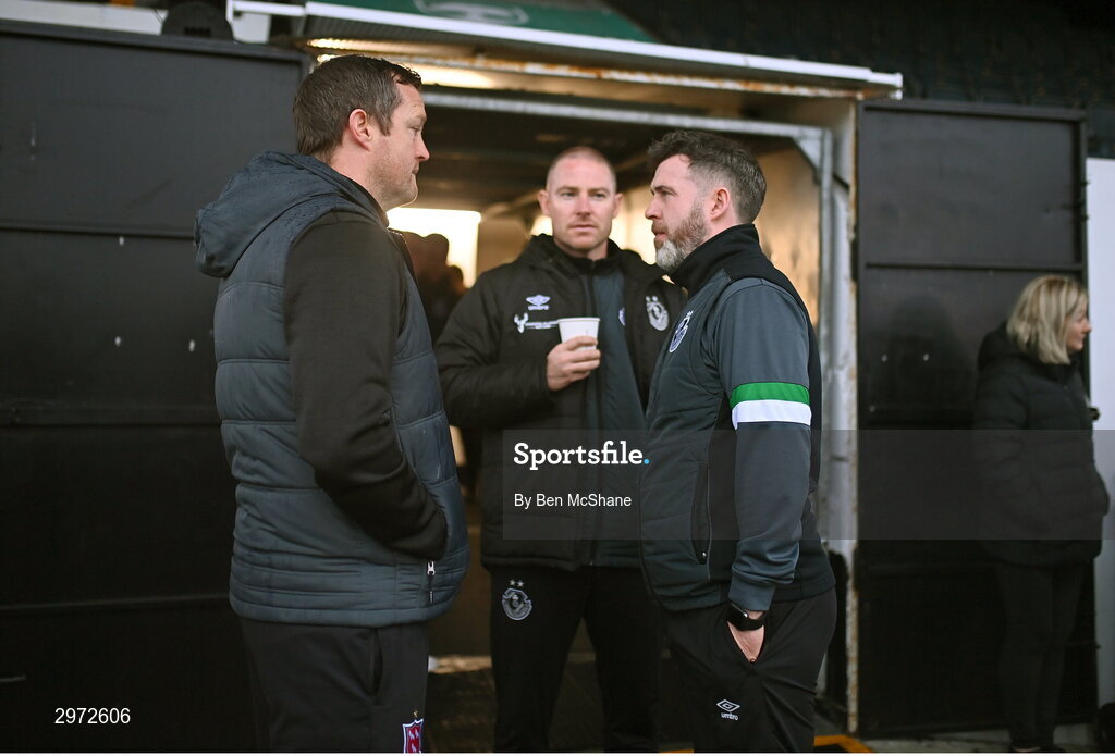 27 October 2024; Dundalk manager Jon Daly, left, inconversation with Shamrock Rovers manager Stephen Bradley, right, and assistant coach Glenn Cronin before the SSE Airtricity Men's Premier Division match between Dundalk and Shamrock Rovers at Oriel Park in Dundalk, Louth. Photo by Ben McShane/Sportsfile