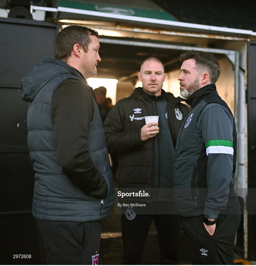 27 October 2024; Dundalk manager Jon Daly, left, inconversation with Shamrock Rovers manager Stephen Bradley, right, and assistant coach Glenn Cronin before the SSE Airtricity Men's Premier Division match between Dundalk and Shamrock Rovers at Oriel Park in Dundalk, Louth. Photo by Ben McShane/Sportsfile