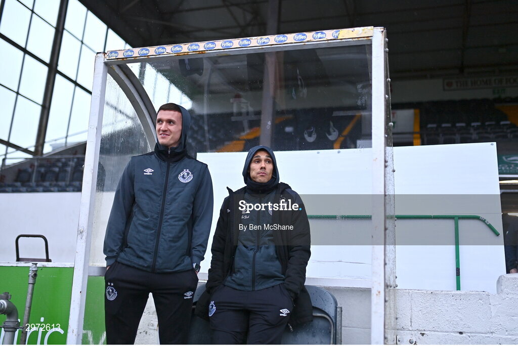 27 October 2024; Johnny Kenny, left, and Graham Burke of Shamrock Rovers take shelter in the fourth officials booth before the SSE Airtricity Men's Premier Division match between Dundalk and Shamrock Rovers at Oriel Park in Dundalk, Louth. Photo by Ben McShane/Sportsfile