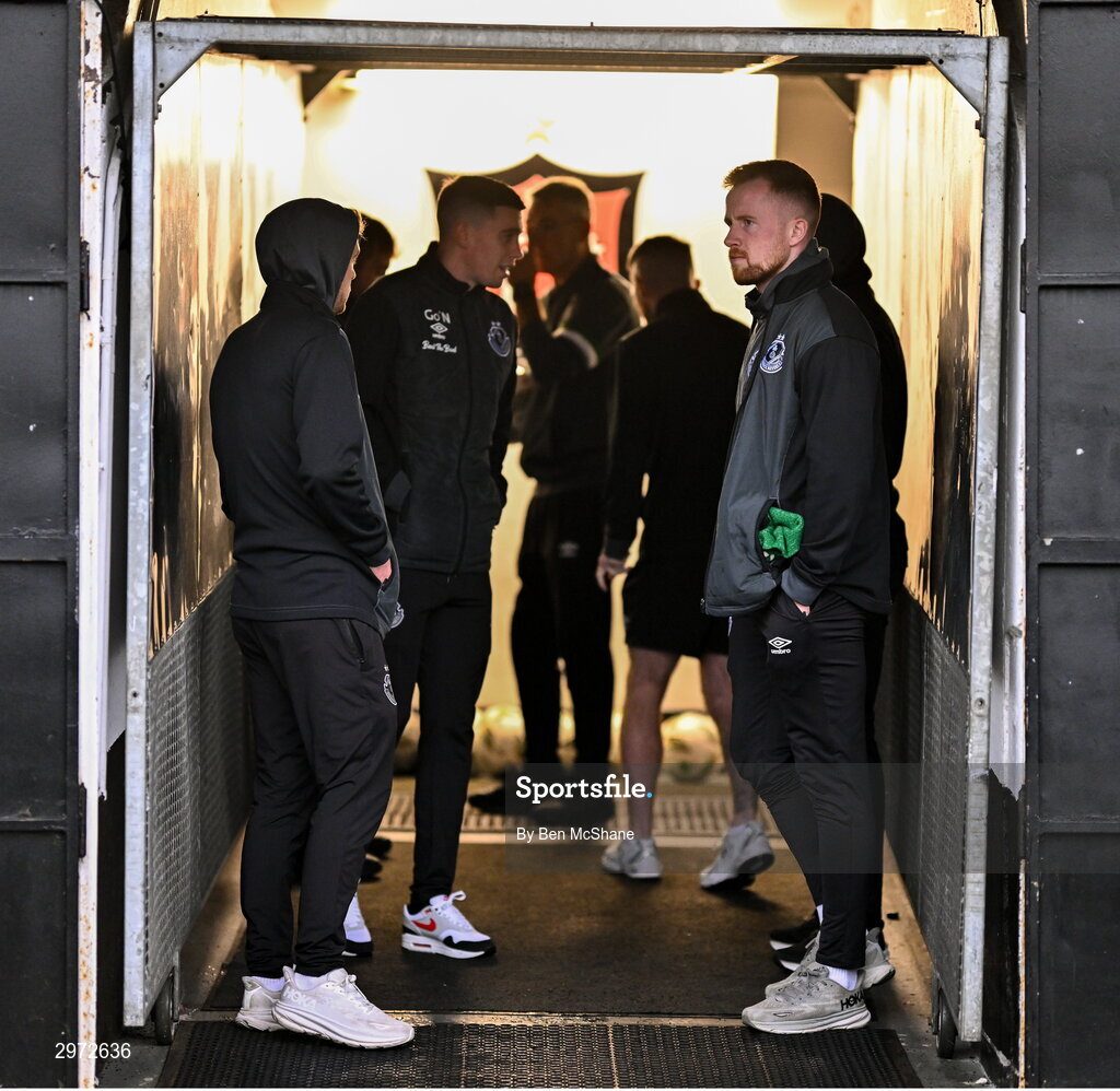 27 October 2024; Shamrock Rovers players, including Sean Hoare, right, take shelter in thr tunner from the rain before the SSE Airtricity Men's Premier Division match between Dundalk and Shamrock Rovers at Oriel Park in Dundalk, Louth. Photo by Ben McShane/Sportsfile