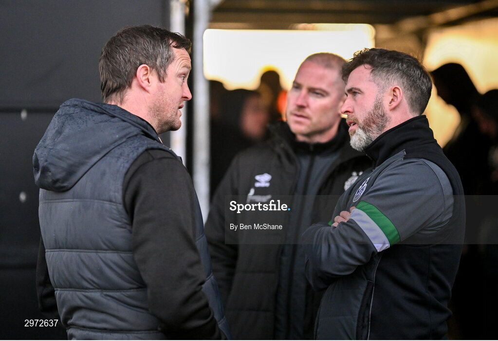 27 October 2024; Dundalk manager Jon Daly, left, in conversation with Shamrock Rovers manager Stephen Bradley, right, and assistant coach Glenn Cronin before the SSE Airtricity Men's Premier Division match between Dundalk and Shamrock Rovers at Oriel Park in Dundalk, Louth. Photo by Ben McShane/Sportsfile