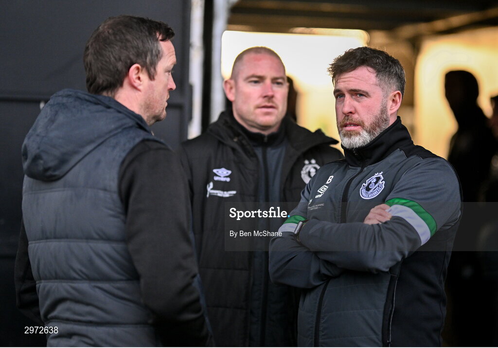 27 October 2024; Dundalk manager Jon Daly, left, in conversation with Shamrock Rovers manager Stephen Bradley, right, and assistant coach Glenn Cronin before the SSE Airtricity Men's Premier Division match between Dundalk and Shamrock Rovers at Oriel Park in Dundalk, Louth. Photo by Ben McShane/Sportsfile