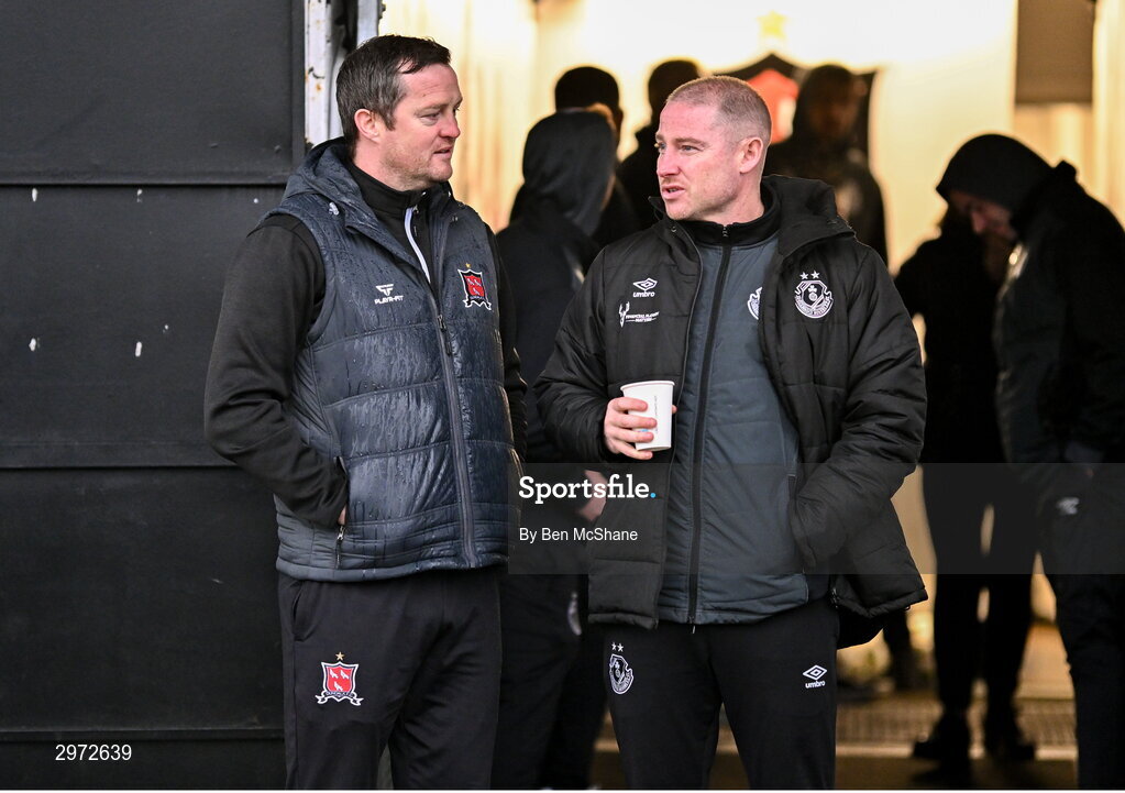 27 October 2024; Dundalk manager Jon Daly in conversation Shamrock Rovers assistant coach Glenn Cronin before the SSE Airtricity Men's Premier Division match between Dundalk and Shamrock Rovers at Oriel Park in Dundalk, Louth. Photo by Ben McShane/Sportsfile