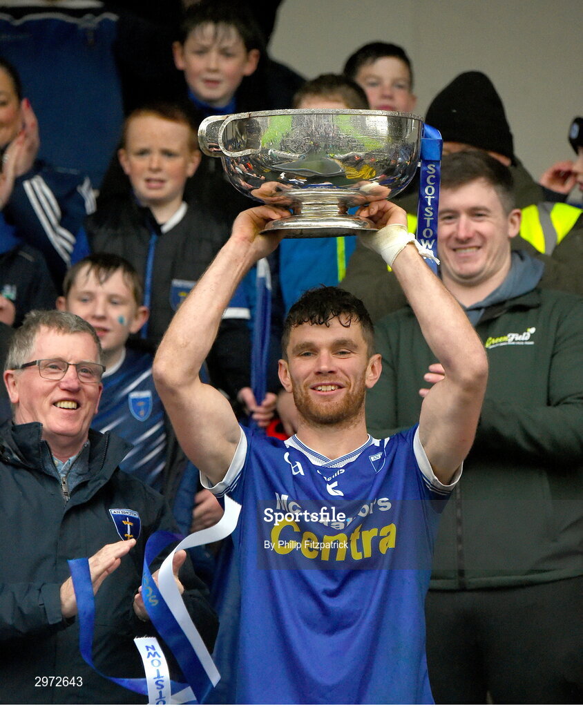 27 October 2024; Scotstown captain Damien McArdle lifts the Mick Duffy cup after the Monaghan County Senior Club Football Championship final match between Clontibret O'Neills and Scotstown at St Tiernach's Park in Clones, Monaghan. Photo by Philip Fitzpatrick/Sportsfile