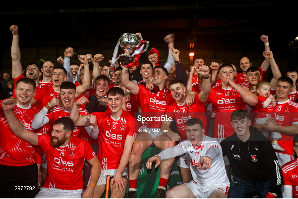 27 October 2024; Darragh O'Donovan of Doon lifts the John Daly Cup and celebrates with teammates after the Limerick County Senior Club Hurling Championship final match between Na Piarsaigh and Doon at TUS Gaelic Grounds in Limerick. Photo by Ray McManus/Sportsfile