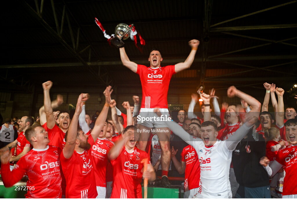 27 October 2024; Darragh O'Donovan of Doon lifts the John Daly Cup and celebrates with teammates after the Limerick County Senior Club Hurling Championship final match between Na Piarsaigh and Doon at TUS Gaelic Grounds in Limerick. Photo by Ray McManus/Sportsfile