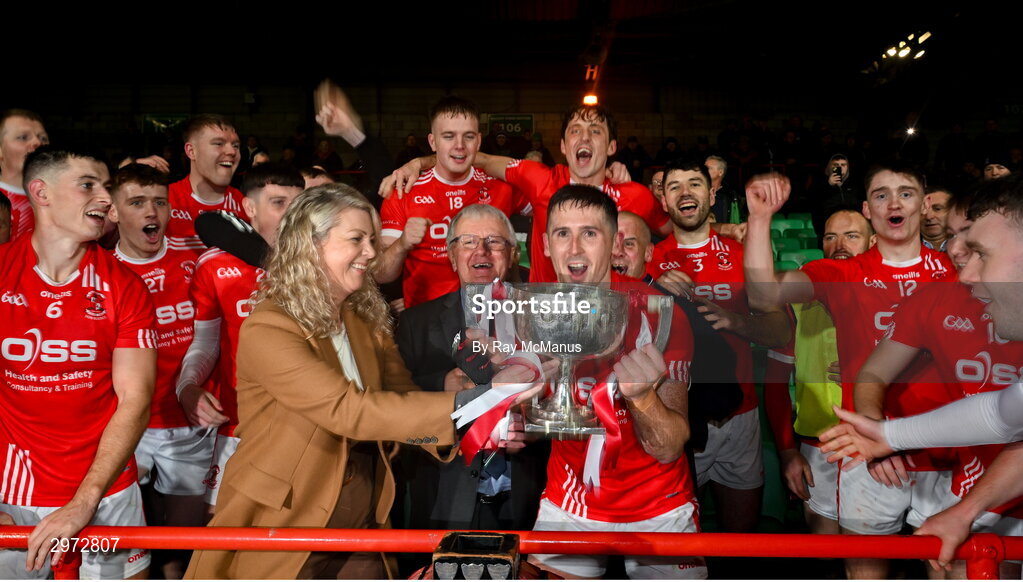 27 October 2024; Darragh O'Donovan of Doon is presented with the John Daly Cup after the Limerick County Senior Club Hurling Championship final match between Na Piarsaigh and Doon at TUS Gaelic Grounds in Limerick. Photo by Ray McManus/Sportsfile