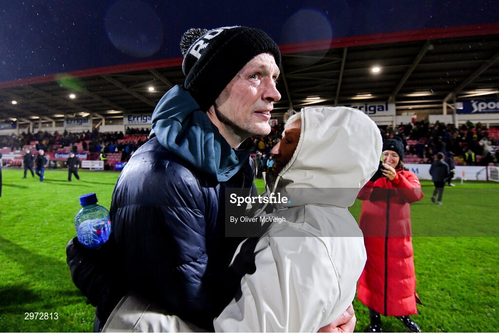 27 October 2024; An emotional Newbridge manager Gary Hetherington along with his mother Eilish celebrates after the Derry County Senior Club Football Championship final match between Glen and Newbridge at Celtic Park in Derry. Photo by Oliver McVeigh/Sportsfile