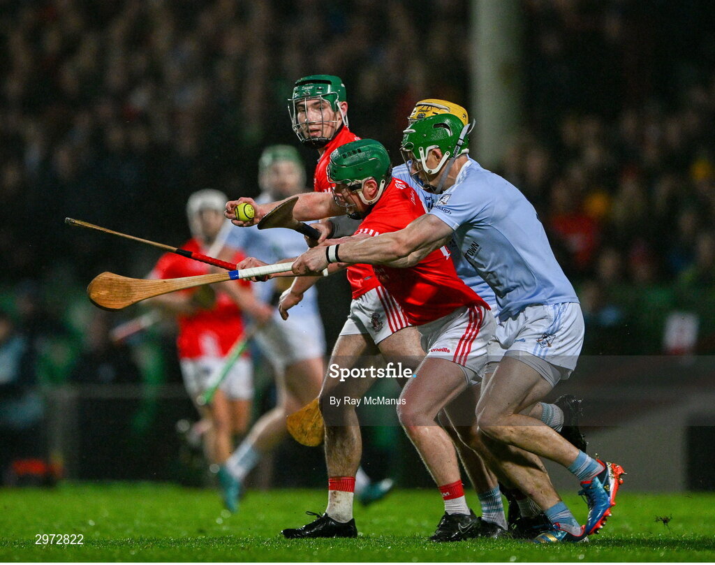 27 October 2024; Jack Ryan of Doon, with Chris Thomas of Doon in support, is tackled by Mike Foley and JJ Carey of Na Piarsaigh during the Limerick County Senior Club Hurling Championship final match between Na Piarsaigh and Doon at TUS Gaelic Grounds in Limerick. Photo by Ray McManus/Sportsfile