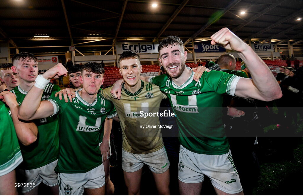 27 October 2024; Óisin Doherty of Newbridge, James Gribbin of Newbridge and Shane McGrogan of Newbridge celebrate after the Derry County Senior Club Football Championship final match between Glen and Newbridge at Celtic Park in Derry. Photo by Oliver McVeigh/Sportsfile