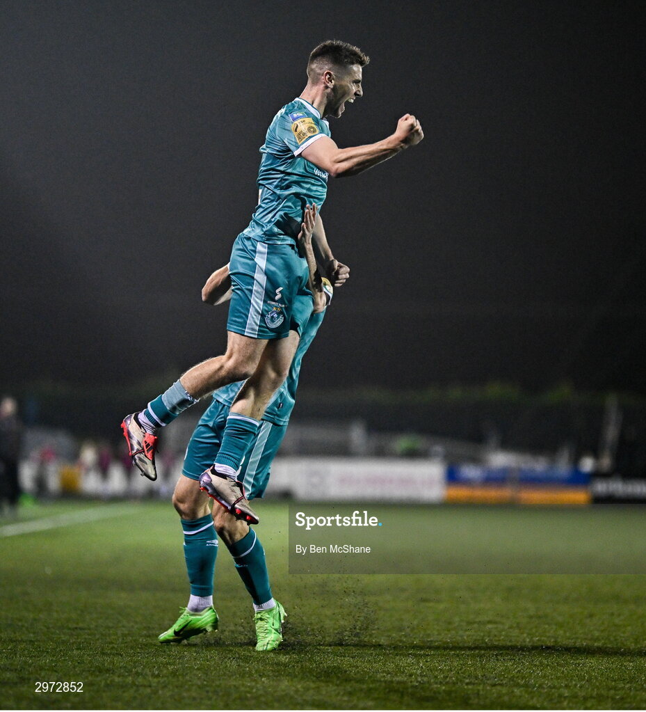 27 October 2024; Dylan Watts of Shamrock Rovers celebrates with teammate Aaron McEneff, right, after scoring their side's first goal during the SSE Airtricity Men's Premier Division match between Dundalk and Shamrock Rovers at Oriel Park in Dundalk, Louth. Photo by Ben McShane/Sportsfile