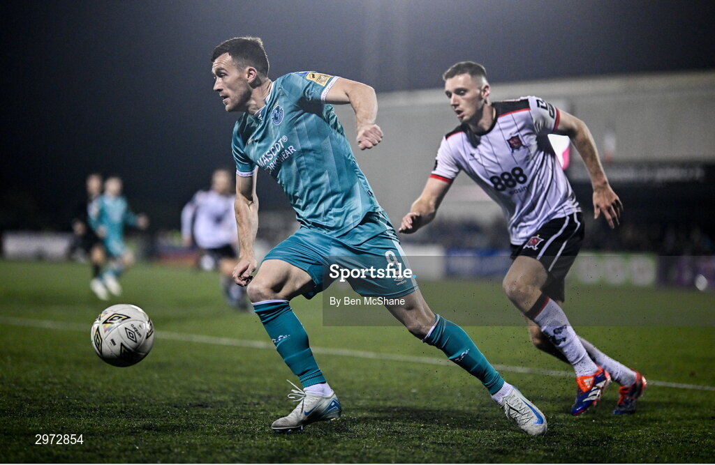 27 October 2024; Aaron Greene of Shamrock Rovers in action against Hayden Cann of Dundalk during the SSE Airtricity Men's Premier Division match between Dundalk and Shamrock Rovers at Oriel Park in Dundalk, Louth. Photo by Ben McShane/Sportsfile