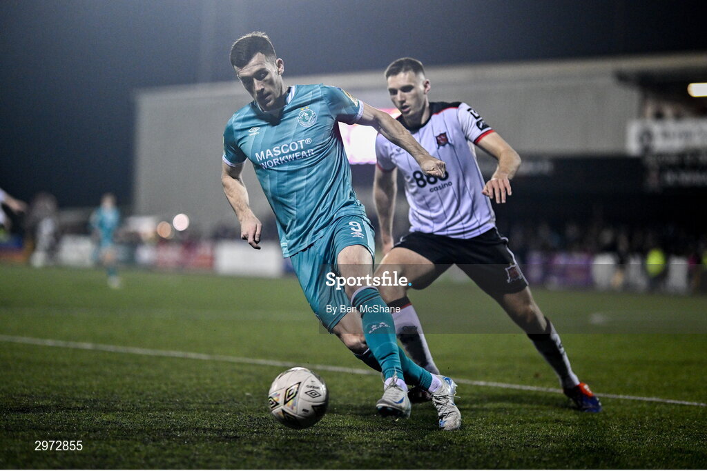 27 October 2024; Aaron Greene of Shamrock Rovers in action against Hayden Cann of Dundalk during the SSE Airtricity Men's Premier Division match between Dundalk and Shamrock Rovers at Oriel Park in Dundalk, Louth. Photo by Ben McShane/Sportsfile