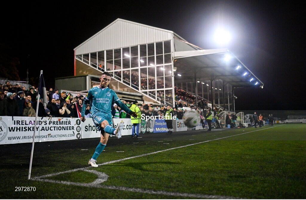 27 October 2024; Jack Byrne of Shamrock Rovers takes a corner-kick during the SSE Airtricity Men's Premier Division match between Dundalk and Shamrock Rovers at Oriel Park in Dundalk, Louth. Photo by Ben McShane/Sportsfile