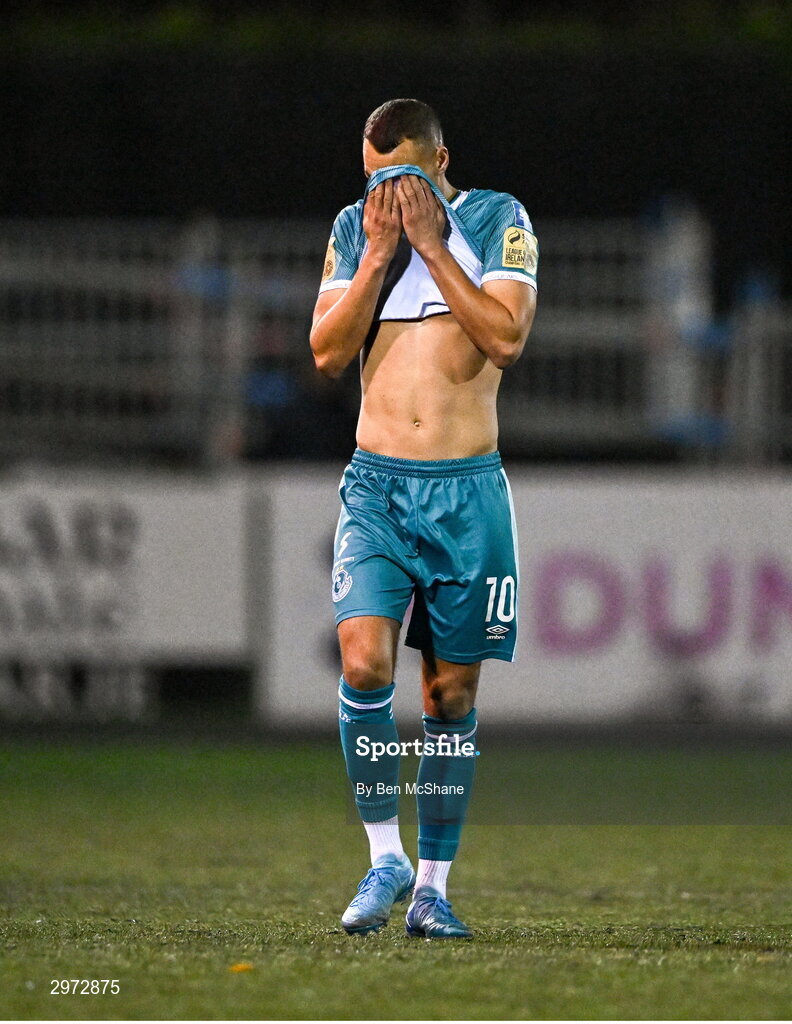27 October 2024; Graham Burke of Shamrock Rovers reacts near the end of the SSE Airtricity Men's Premier Division match between Dundalk and Shamrock Rovers at Oriel Park in Dundalk, Louth. Photo by Ben McShane/Sportsfile