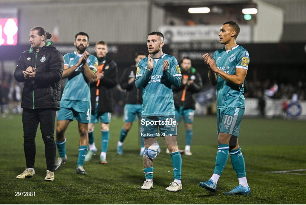 27 October 2024; Shamrock Rovers players, inclduing Graham Burke, right, and Jack Byrne after the SSE Airtricity Men's Premier Division match between Dundalk and Shamrock Rovers at Oriel Park in Dundalk, Louth. Photo by Ben McShane/Sportsfile