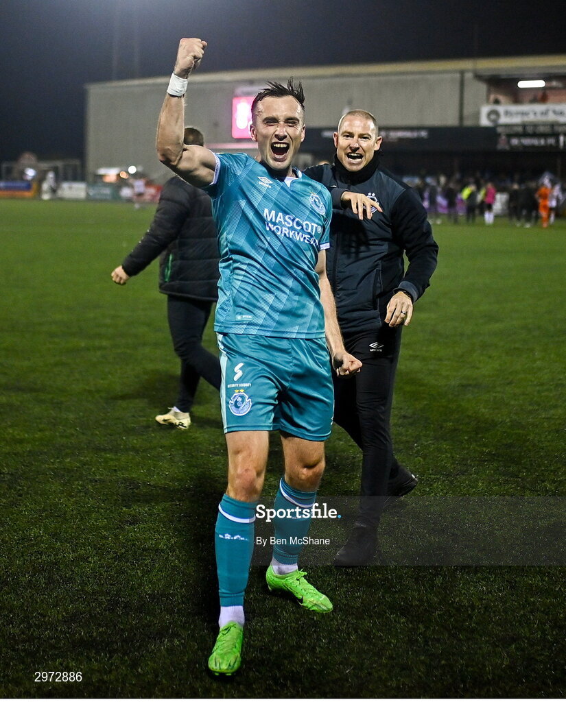 27 October 2024; Shamrock Rovers assistant coach Glenn Cronin pushes Aaron McEneff of Shamrock Rovers to celebrate toward the travelling supporters after the SSE Airtricity Men's Premier Division match between Dundalk and Shamrock Rovers at Oriel Park in Dundalk, Louth. Photo by Ben McShane/Sportsfile