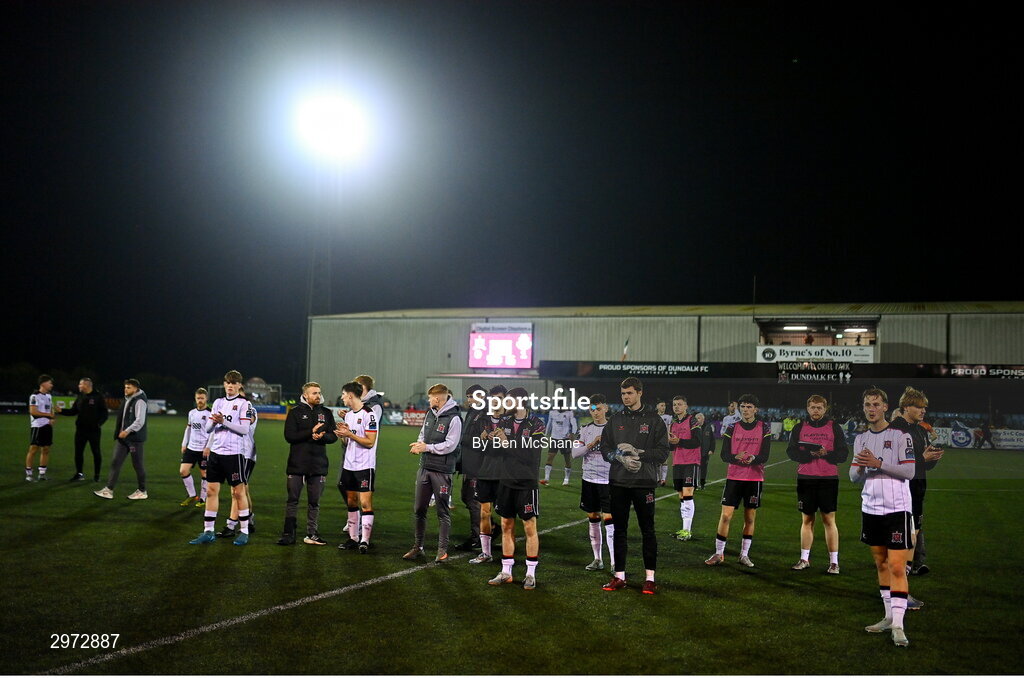27 October 2024; Dundalk players react after their last home game of the season, the SSE Airtricity Men's Premier Division match between Dundalk and Shamrock Rovers at Oriel Park in Dundalk, Louth. Photo by Ben McShane/Sportsfile