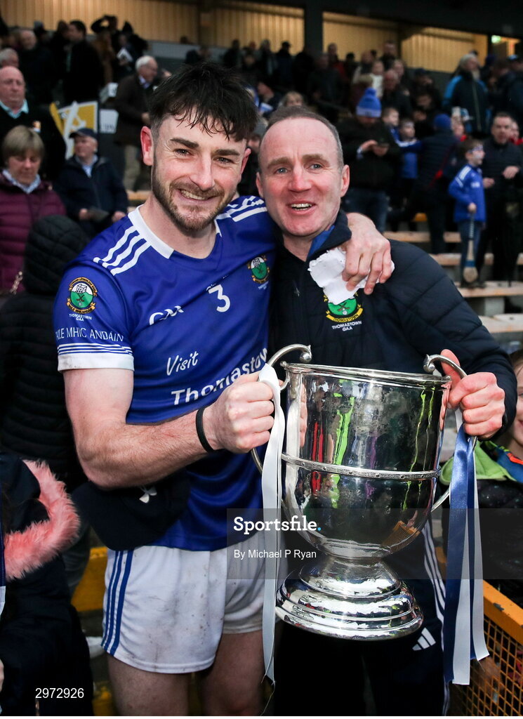27 October 2024; Thomastown captain Jay Burke with manager Noel Doherty after the Kilkenny County Senior Club Hurling Championship final match between O’Loughlin Gaels and Thomastown at UPMC Nowlan Park in Kilkenny. Photo by Michael P Ryan/Sportsfile