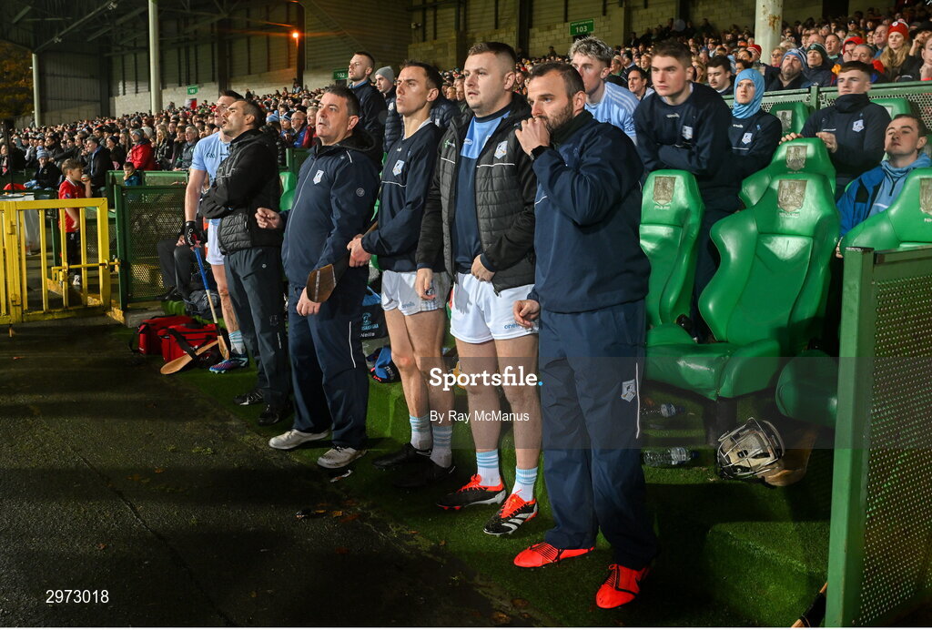 27 October 2024; Na Piarsaigh players and officials watch the closing minutes of the Limerick County Senior Club Hurling Championship final match between Na Piarsaigh and Doon at TUS Gaelic Grounds in Limerick. Photo by Ray McManus/Sportsfile