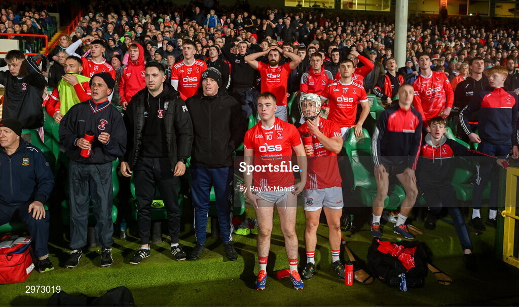 27 October 2024; Doon players and officials watch the closing minutes of the Limerick County Senior Club Hurling Championship final match between Na Piarsaigh and Doon at TUS Gaelic Grounds in Limerick. Photo by Ray McManus/Sportsfile
