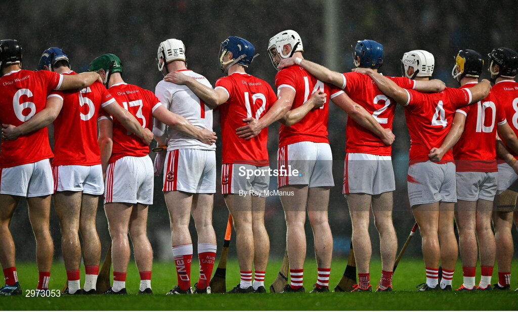 27 October 2024; Doon players stand for the National Anthem before the Limerick County Senior Club Hurling Championship final match between Na Piarsaigh and Doon at TUS Gaelic Grounds in Limerick. Photo by Ray McManus/Sportsfile