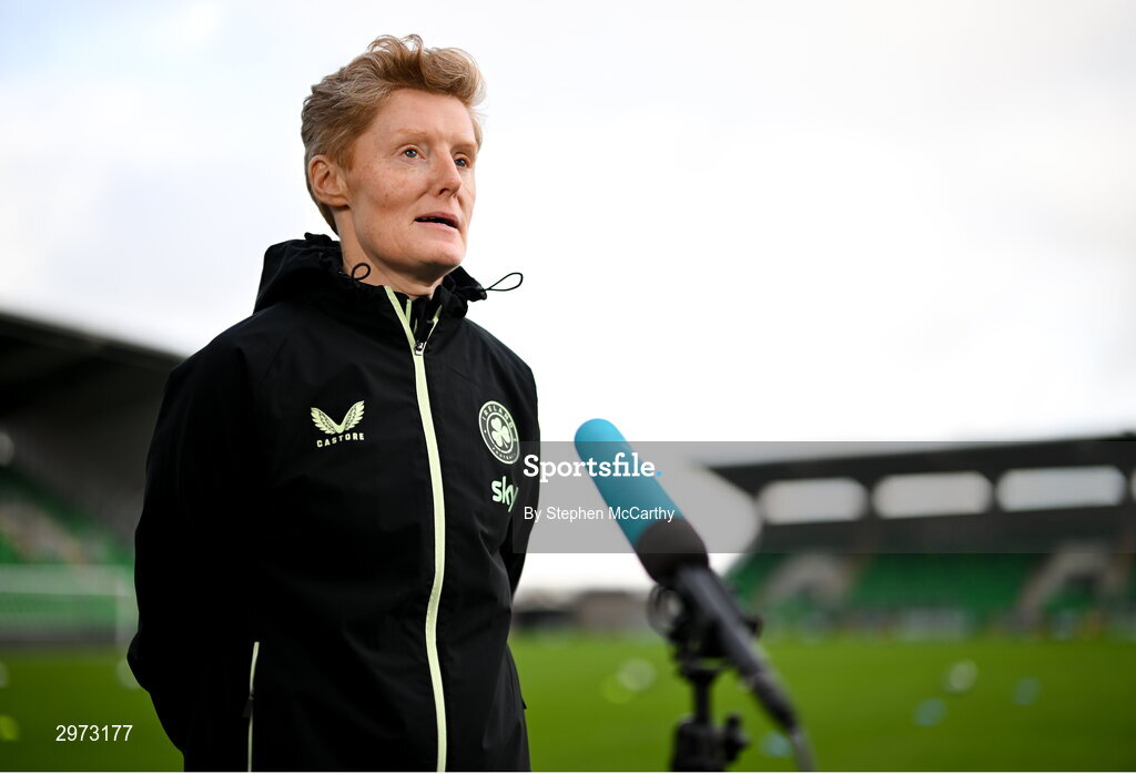 28 October 2024; Head coach Eileen Gleeson speaks to the media during a Republic of Ireland women press conference at Tallaght Stadium in Dublin. Photo by Stephen McCarthy/Sportsfile
