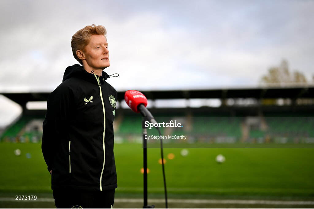 28 October 2024; Head coach Eileen Gleeson speaks to the media during a Republic of Ireland women press conference at Tallaght Stadium in Dublin. Photo by Stephen McCarthy/Sportsfile