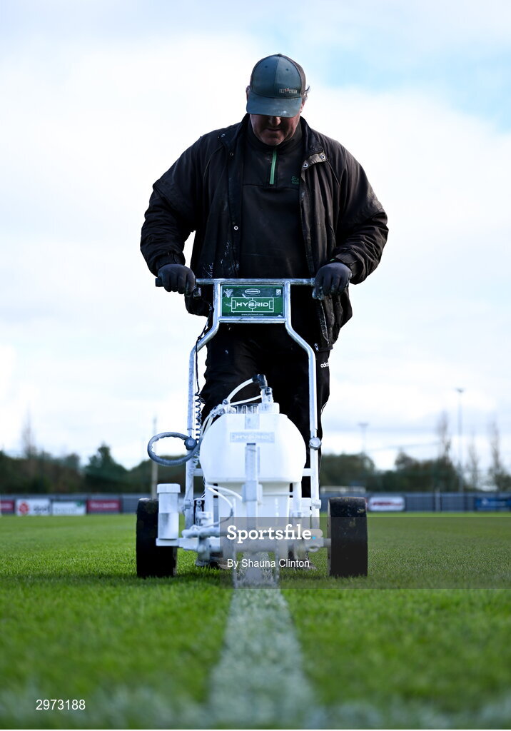 28 October 2024; Wexford groundskeeper Aidan Furlong tends to the pitch before the SSE Airtricity Men's First Division Play-Off semi-final second leg match between Wexford and Athlone Town at Ferrycarrig Park in Wexford. Photo by Shauna Clinton/Sportsfile