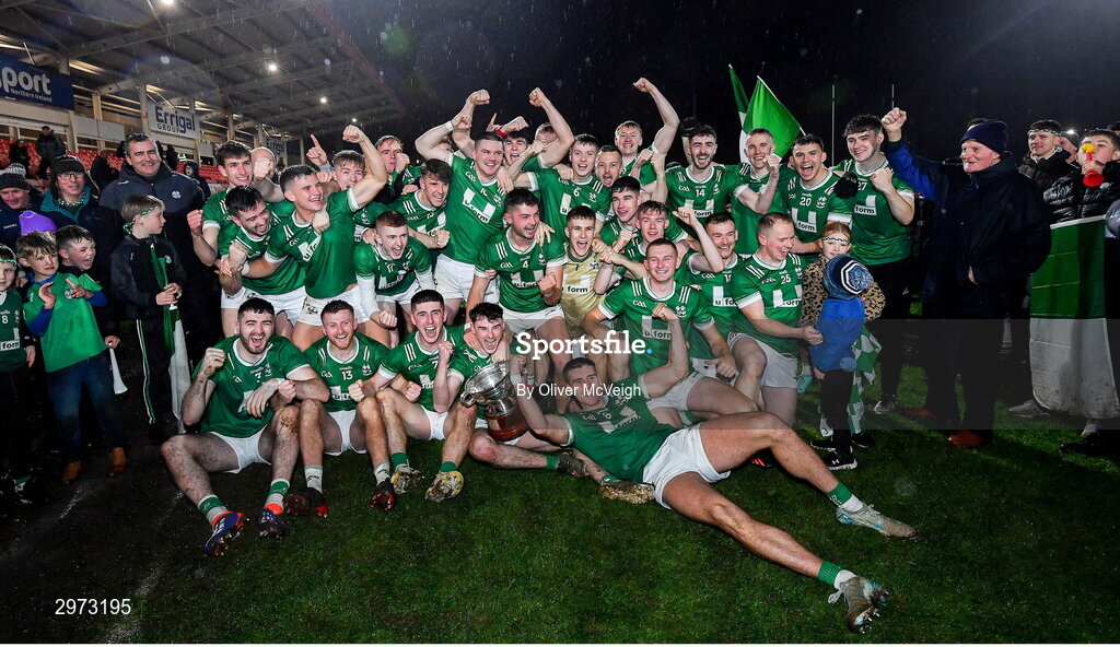 27 October 2024; Newbridge players celebrate with the cup after his side's victory in the Derry County Senior Club Football Championship final match between Glen and Newbridge at Celtic Park in Derry. Photo by Oliver McVeigh/Sportsfile