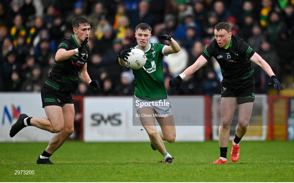 27 October 2024; Patrick McMullan of Newbridge in action against Conor Convery of Glen during the Derry County Senior Club Football Championship final match between Glen and Newbridge at Celtic Park in Derry. Photo by Oliver McVeigh/Sportsfile