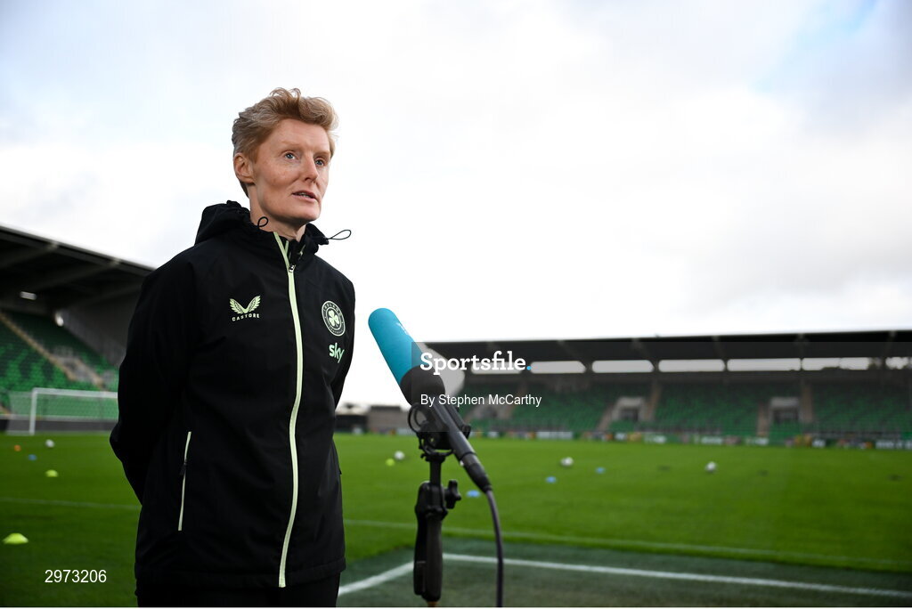 28 October 2024; Head coach Eileen Gleeson speaks to the media during a Republic of Ireland women press conference at Tallaght Stadium in Dublin. Photo by Stephen McCarthy/Sportsfile