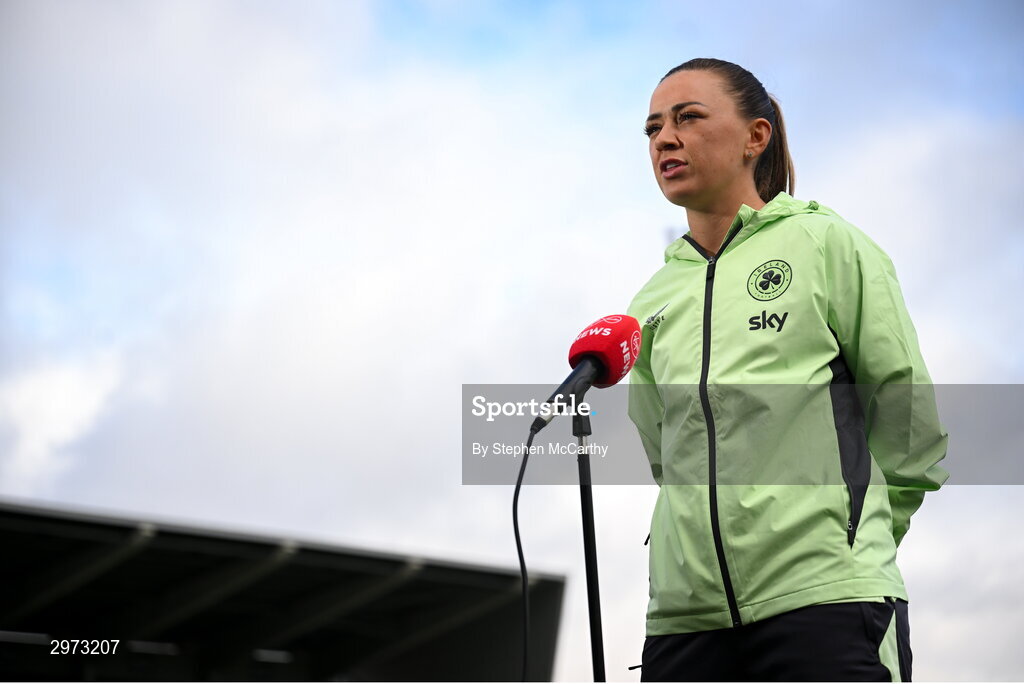 28 October 2024; Katie McCabe speaks to the media during a Republic of Ireland women press conference at Tallaght Stadium in Dublin. Photo by Stephen McCarthy/Sportsfile