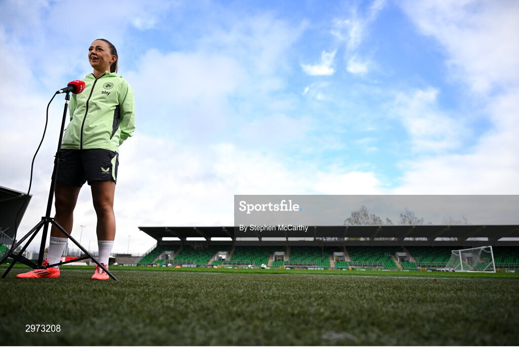 28 October 2024; Katie McCabe speaks to the media during a Republic of Ireland women press conference at Tallaght Stadium in Dublin. Photo by Stephen McCarthy/Sportsfile