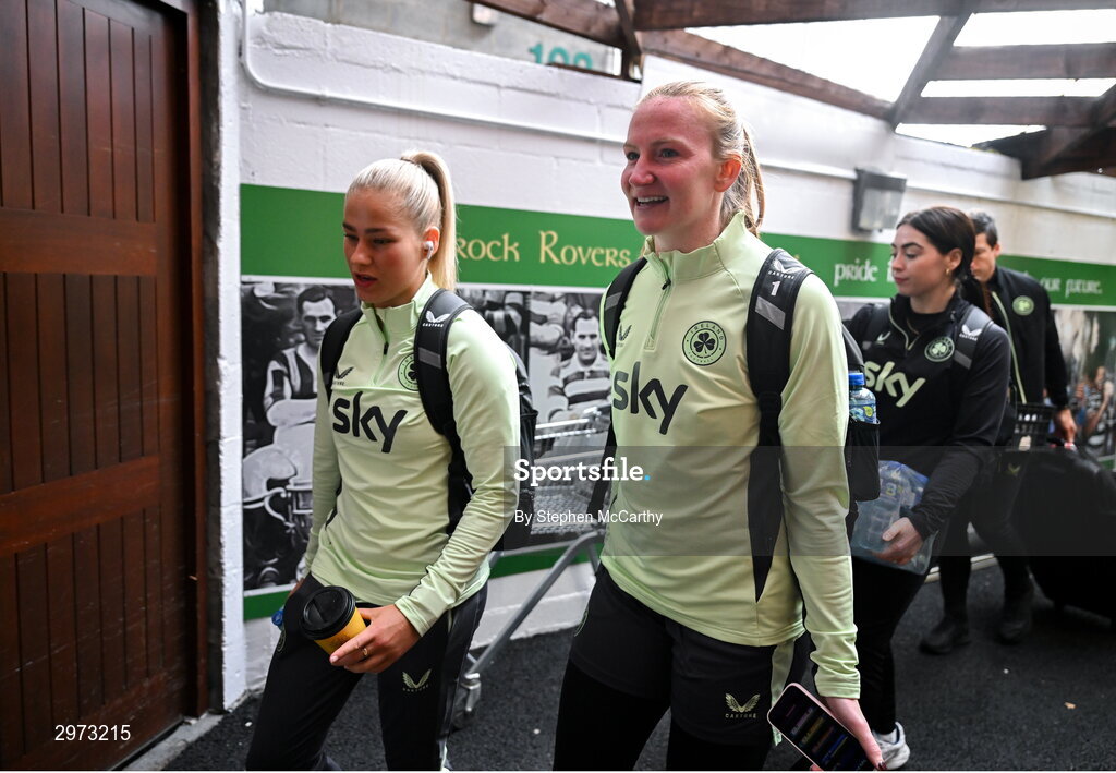 28 October 2024; Goalkeeper Courtney Brosnan and Tara O'Hanlon, left, arrive for a Republic of Ireland women's training session at Tallaght Stadium in Dublin. Photo by Stephen McCarthy/Sportsfile