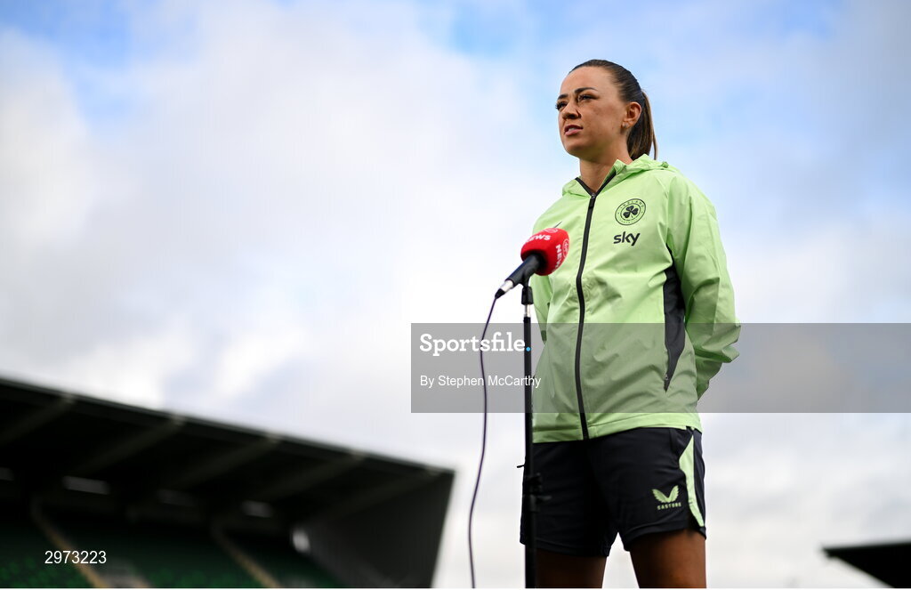 28 October 2024; Katie McCabe speaks to the media during a Republic of Ireland women press conference at Tallaght Stadium in Dublin. Photo by Stephen McCarthy/Sportsfile