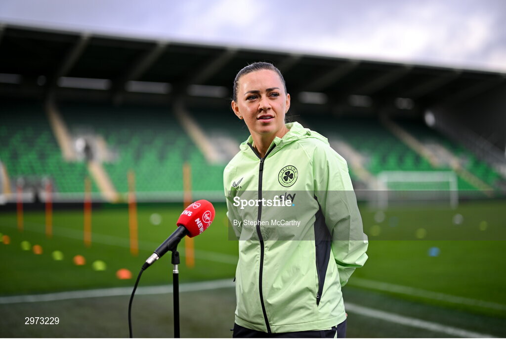 28 October 2024; Katie McCabe speaks to the media during a Republic of Ireland women press conference at Tallaght Stadium in Dublin. Photo by Stephen McCarthy/Sportsfile