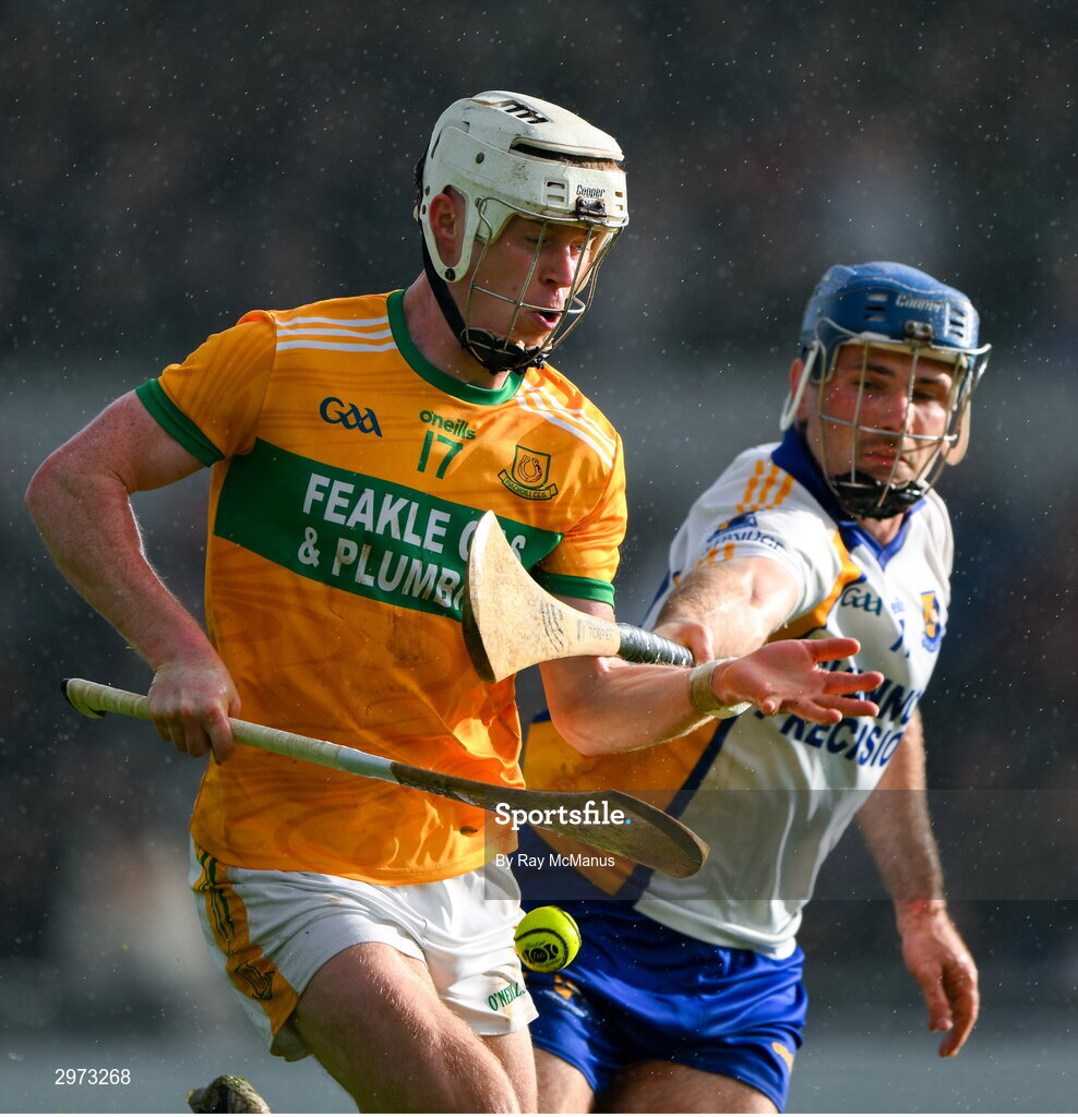 28 October 2024; Steven Conway of Feakle is tackled by Noel Purcell of Sixmilebridge during the Clare County Senior Club Hurling Championship final match between Sixmilebridge and Feakle at Cusack Park in Clare. Photo by Ray McManus/Sportsfile