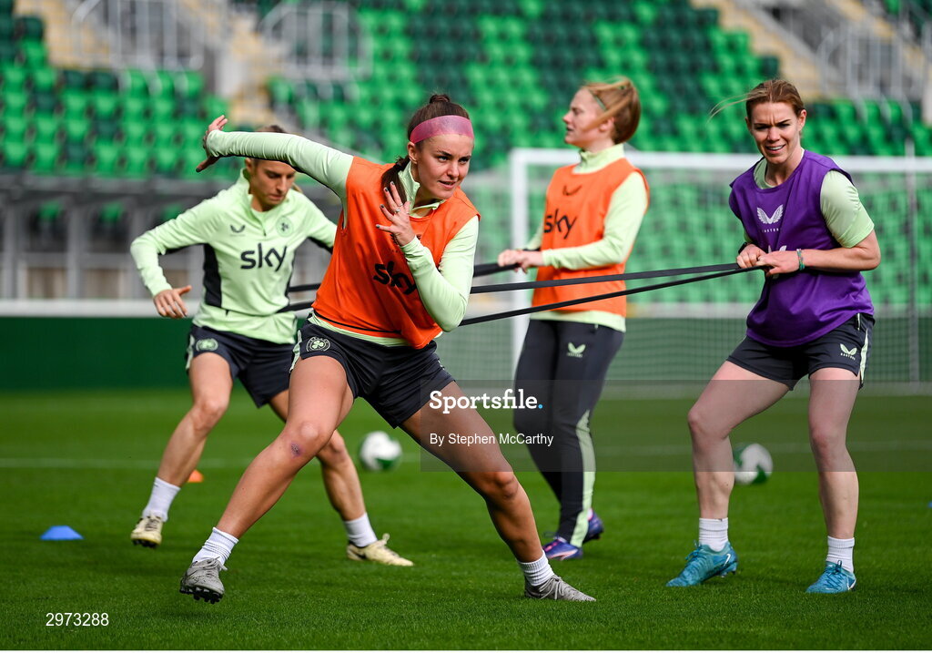 28 October 2024; Caitlin Hayes and Aoife Mannion, right, during a Republic of Ireland women's training session at Tallaght Stadium in Dublin. Photo by Stephen McCarthy/Sportsfile