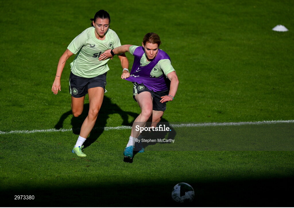 28 October 2024; Aoife Mannion and Abbie Larkin, left, during a Republic of Ireland women's training session at Tallaght Stadium in Dublin. Photo by Stephen McCarthy/Sportsfile