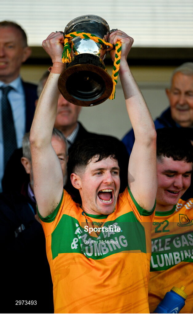 28 October 2024; The Feakle captain Oisín Donnellan lifts the Canon Hamilton Cup after the Clare County Senior Club Hurling Championship final match between Sixmilebridge and Feakle at Cusack Park in Clare. Photo by Ray McManus/Sportsfile