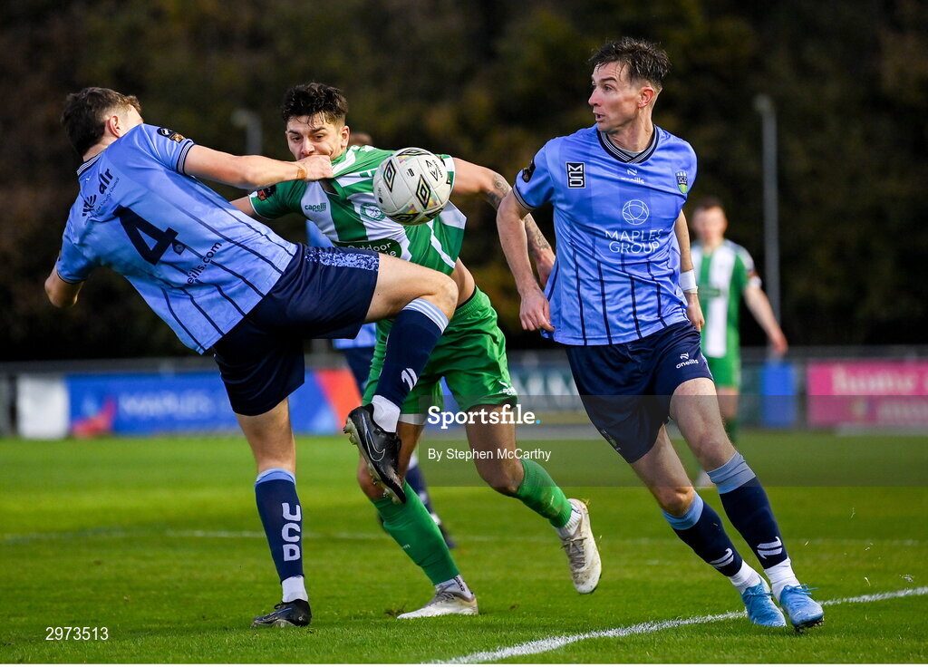 28 October 2024; Cristian Magerusan of Bray Wanderers in action against Eanna Clancy, left, and Ronan Finn of UCD during the SSE Airtricity Men's First Division play-off semi-final second leg match between UCD and Bray Wanderers at UCD Bowl in Dublin. Photo by Stephen McCarthy/Sportsfile