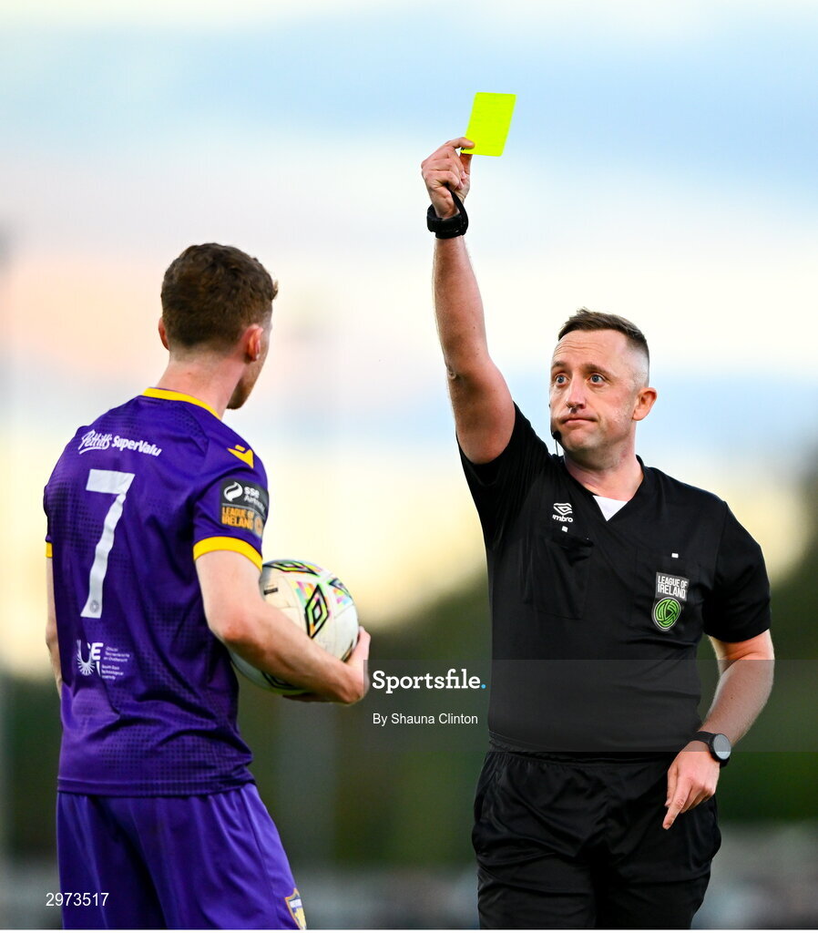 28 October 2024; Referee Alan Patchell shows a yellow card to Mikie Rowe of Wexford during the SSE Airtricity Men's First Division Play-Off semi-final second leg match between Wexford and Athlone Town at Ferrycarrig Park in Wexford. Photo by Shauna Clinton/Sportsfile