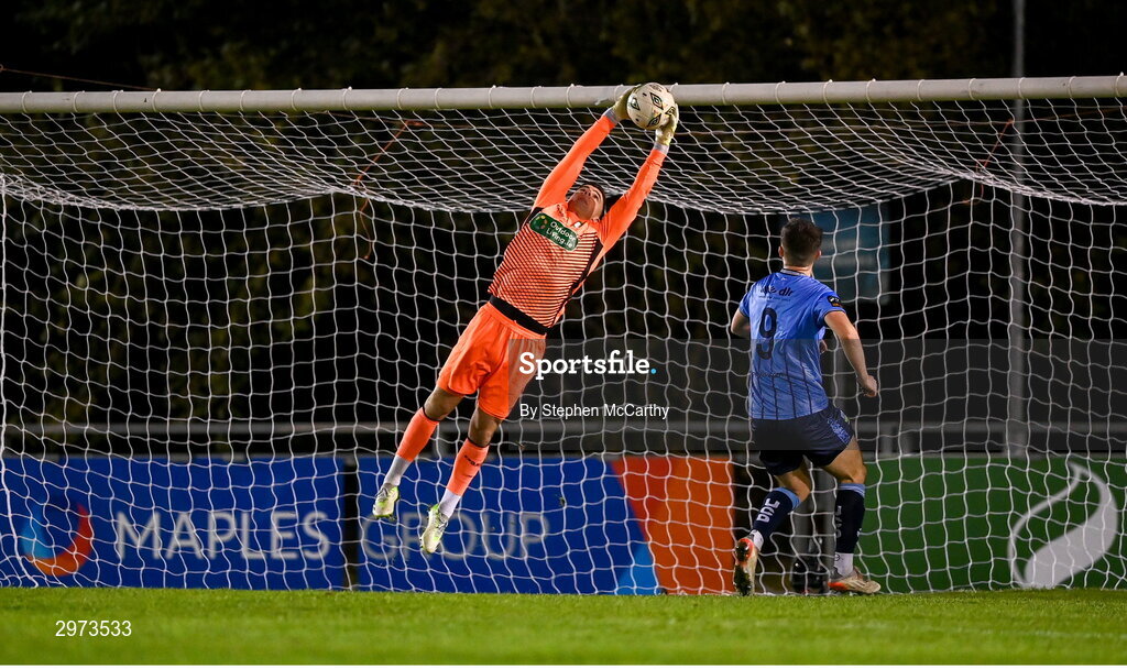 28 October 2024; Bray Wanderers goalkeeper Jimmy Corcoran makes a save during the SSE Airtricity Men's First Division play-off semi-final second leg match between UCD and Bray Wanderers at UCD Bowl in Dublin. Photo by Stephen McCarthy/Sportsfile
