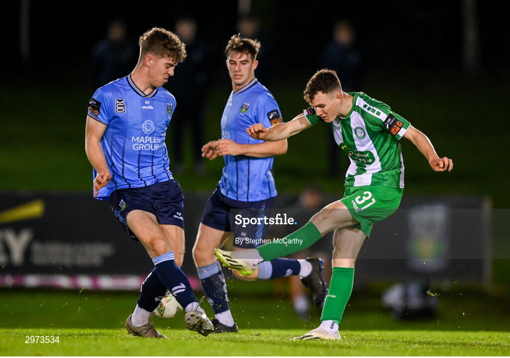 28 October 2024; Kieran Cruise of Bray Wanderers in action against Nial Holohan of UCD during the SSE Airtricity Men's First Division play-off semi-final second leg match between UCD and Bray Wanderers at UCD Bowl in Dublin. Photo by Stephen McCarthy/Sportsfile