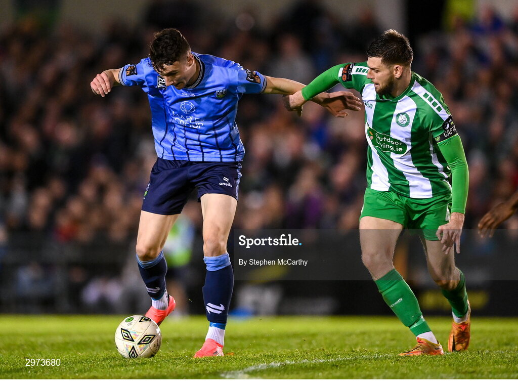 28 October 2024; Jake Doyle of UCD in action against Kilian Cantwell of Bray Wanderers during the SSE Airtricity Men's First Division play-off semi-final second leg match between UCD and Bray Wanderers at UCD Bowl in Dublin. Photo by Stephen McCarthy/Sportsfile