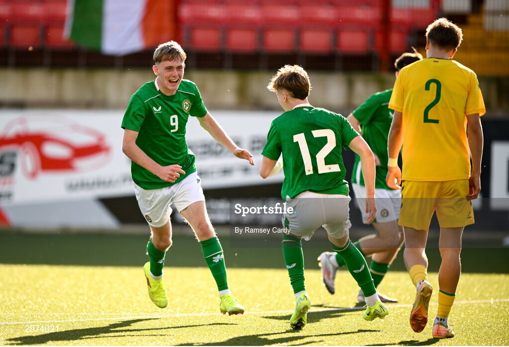 29 October 2024; Michael Noonan of Republic of Ireland celebrates after scoring his side's second goal during the UEFA U17 European Championships Round 1 Qualifier match between Republic of Ireland and Lithuania at Inver Park in Larne, Antrim. Photo by Ramsey Cardy/Sportsfile